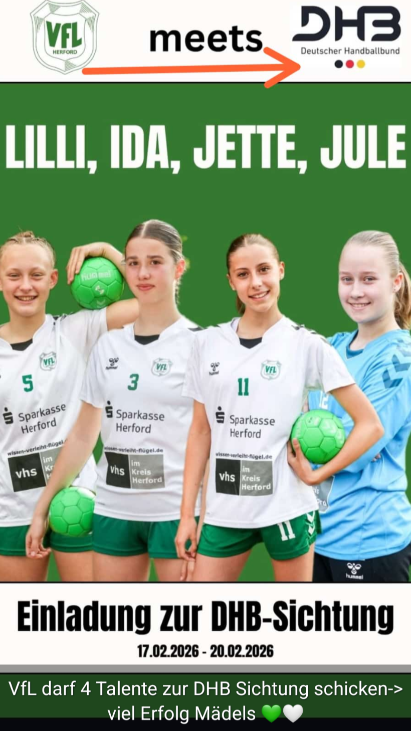 Vom 17.02. bis zum 20.02.2026 dürfen Lilli, Ida, Jette und Jule ihr Können in Albstadt unter Beweis stellen. Dort präsentieren sie sich gemeinsam mit dem Westfalenauswahl-Kader den Sichterinnen und Sichtern des Deutschen Handballbundes.